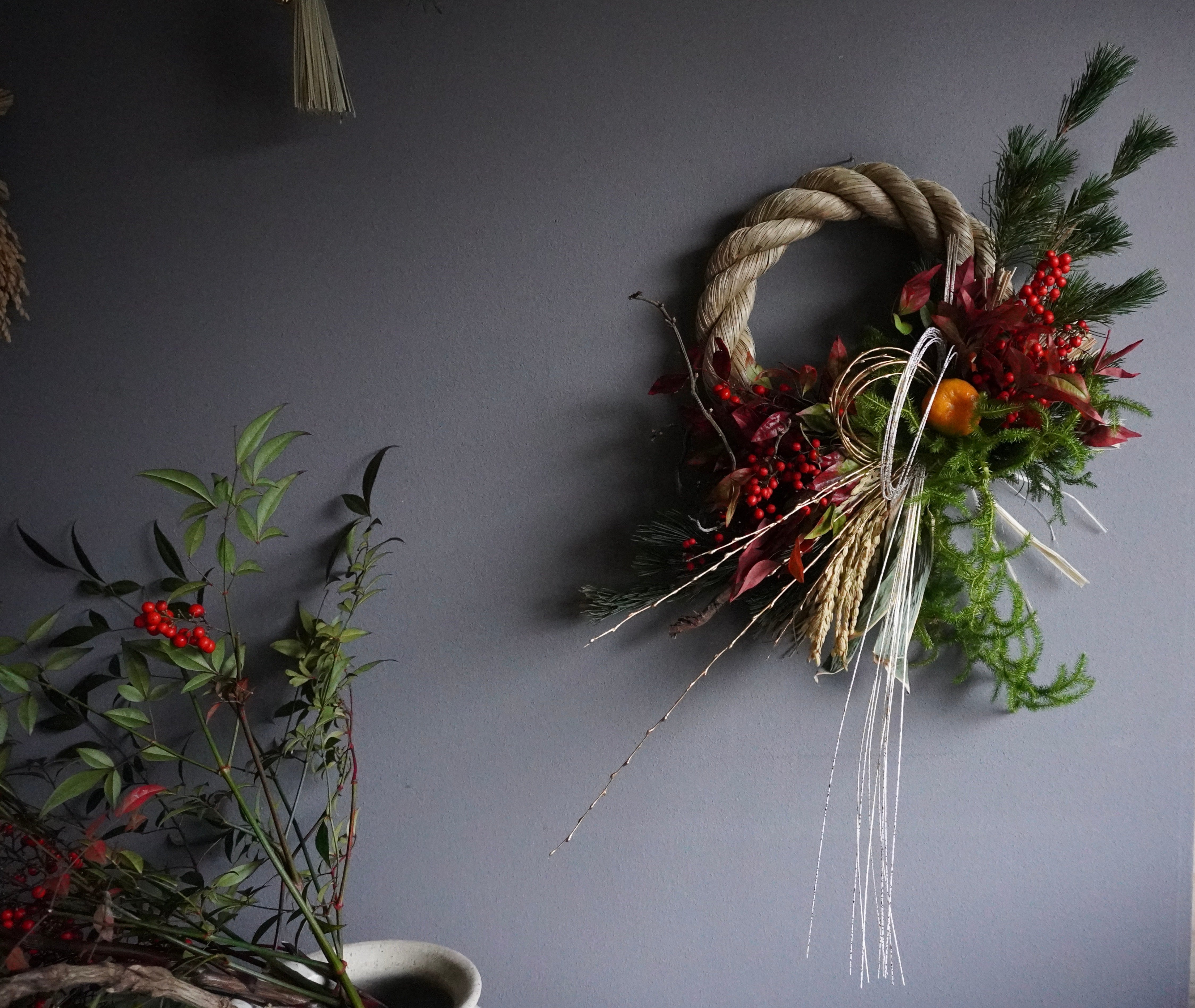 ひとつひとつの花材が新年を寿ぐ願いを重ねたしめ飾りです。